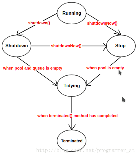 RUNNING: -1 << COUNT_BITS,即高 3 位为 111,该状态的线程池会接收新任务,并处理阻塞队列中的任务;SHUTDOWN: 0 << COUNT_BITS,即高 3 位为 000,该状态的线程池不会接收新任务,但会处理阻塞队列中的任务;STOP: 1 << COUNT_BITS,即高 3 位为 001,该状态的线程不会接收新任务,也不会处理阻塞队列中的任务,而且会中断正在运行的任务;TIDYING: 2 << COUNT_BITS,即高 3 位为 010, 所有的任务都已经终止;TERMINATED: 3 << COUNT_BITS,即高 3 位为 011, terminated()方法已经执行完成