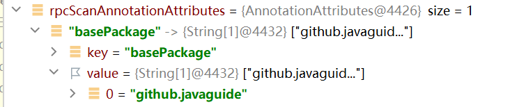 AnnotationAttributes rpcScanAnnotationAttributes = AnnotationAttributes.fromMap(annotationMetadata.getAnnotationAttributes(RpcScan.class.getName()));fromMap里面得到的是个Map类型,key为注解属性名,value为其相应的值,最终将其封装为AnnotationAttributes