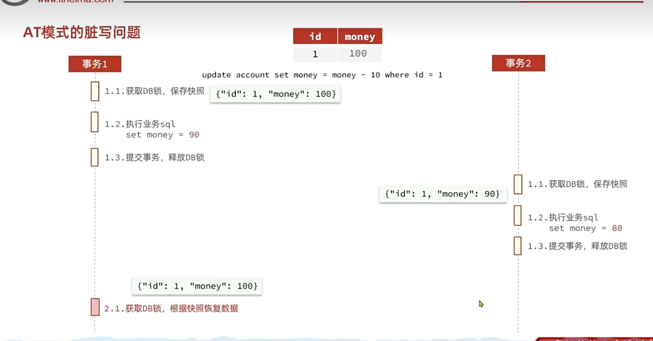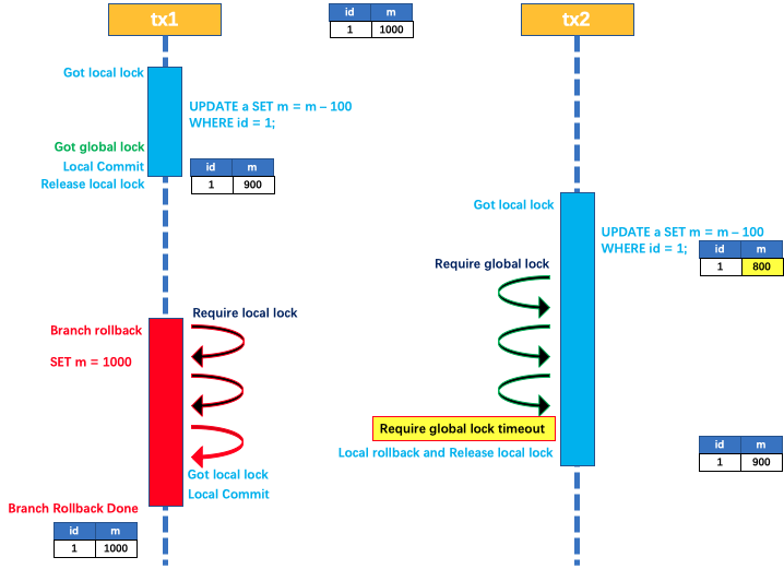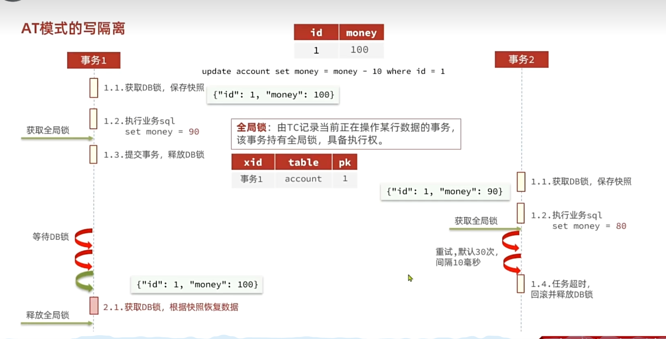 }- 提交前,向 TC 注册分支:申请 product 表中,主键值等于 1 的记录的 全局锁 。
