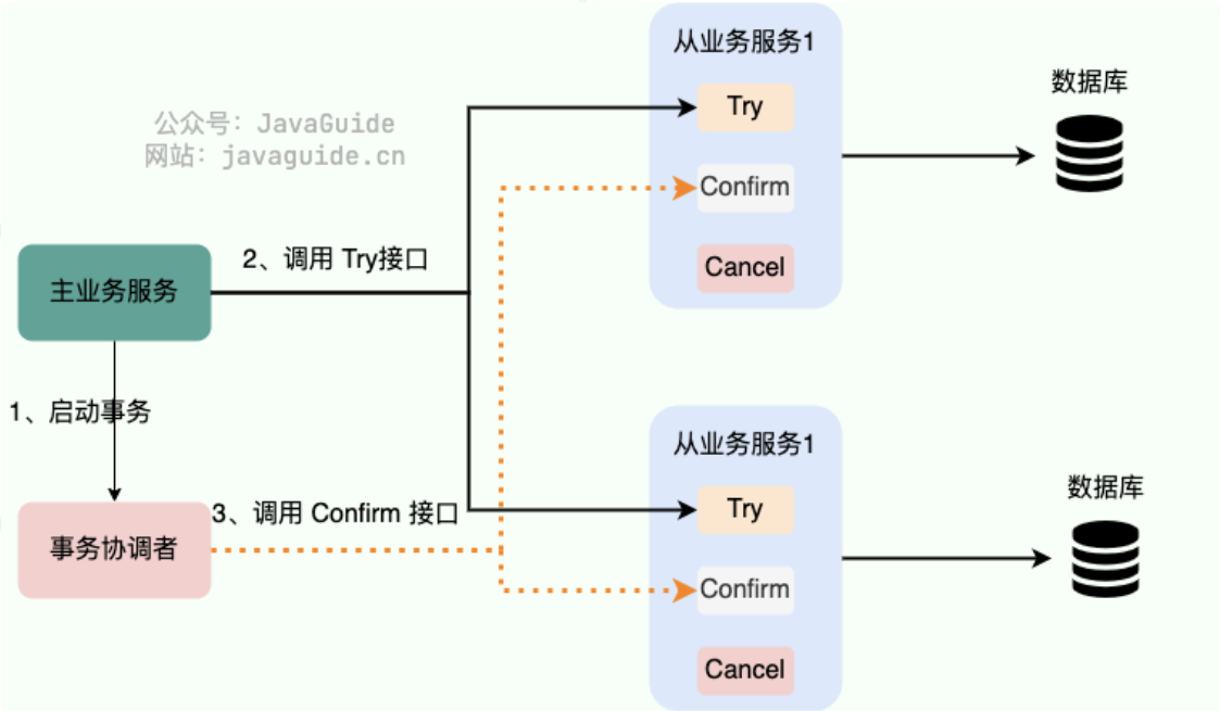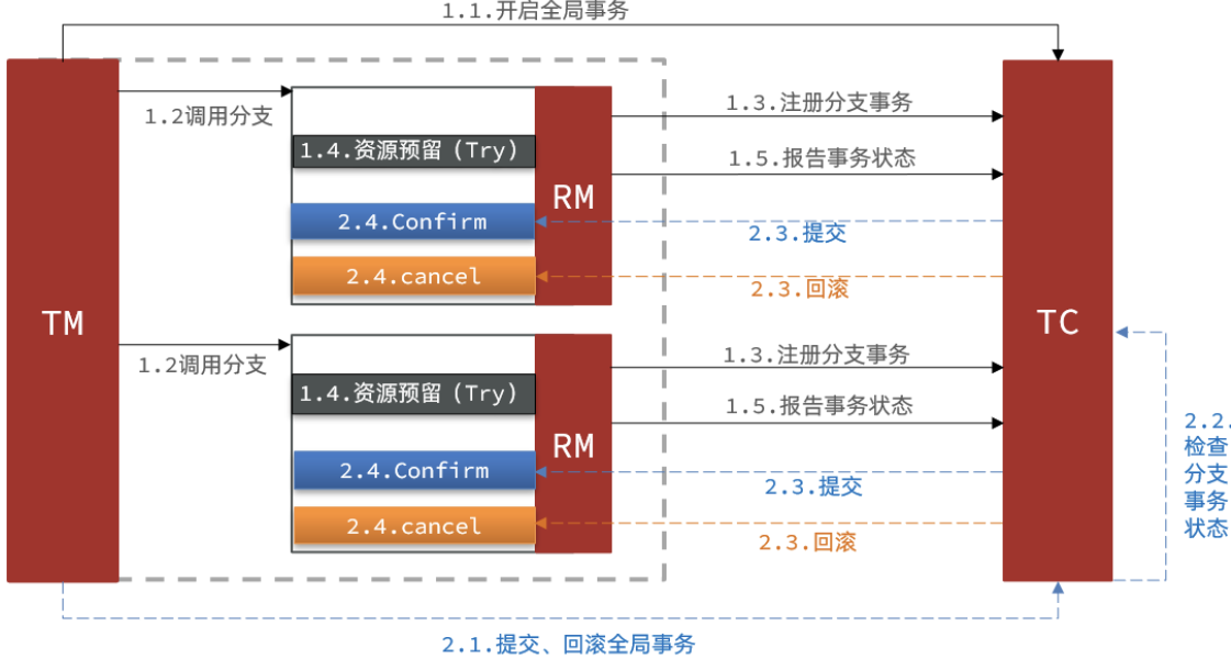- Confirm(确认阶段): 确认执行。当所有事务参与者的 Try 阶段执行成功就会执行 Confirm ,Confirm 阶段会处理 Try 阶段预留的业务资源。否则,就会执行 Cancel
