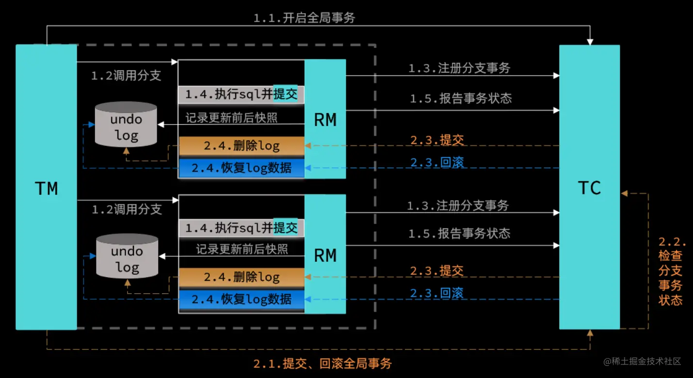 - 本地事务提交:业务数据的更新和前面步骤中生成的 UNDO LOG 一并提交。