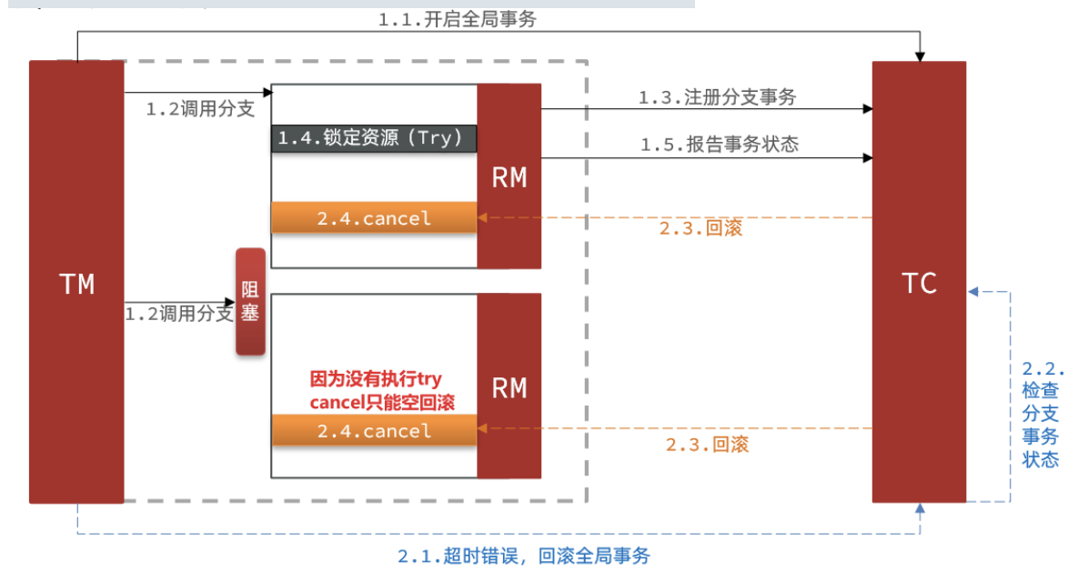执行try操作时,应当判断cancel是否已经执行过了,如果已经执行,应当阻止空回滚后的try操作,避免悬挂